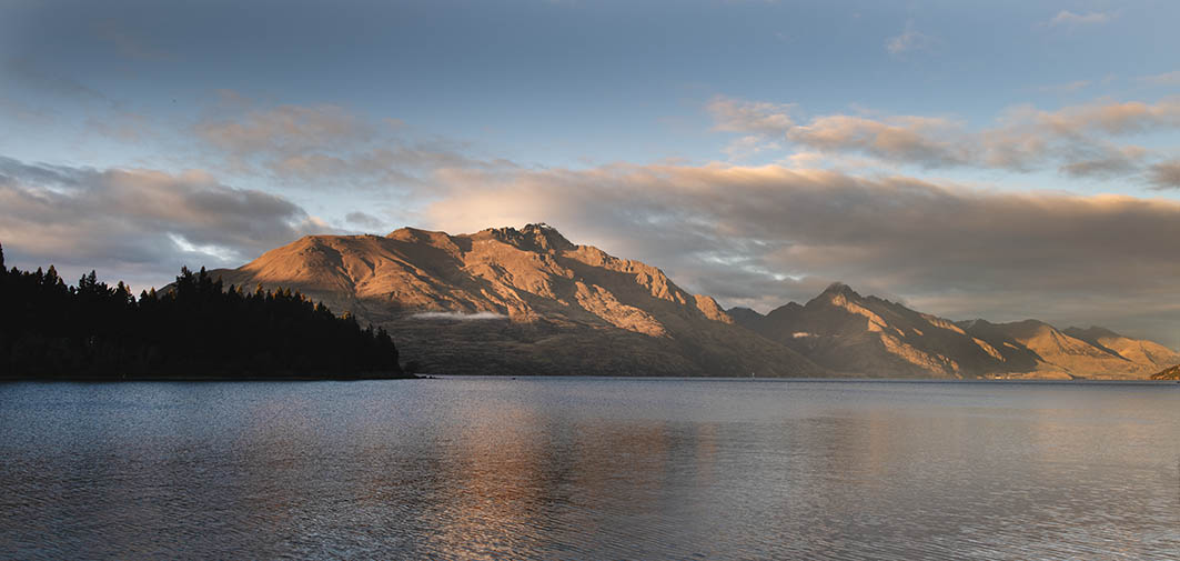 At sunrise, the sun gently licks the peaks of Queenstown’s mountains, casting golden light across rugged silhouettes as the day awakens in quiet splendour.