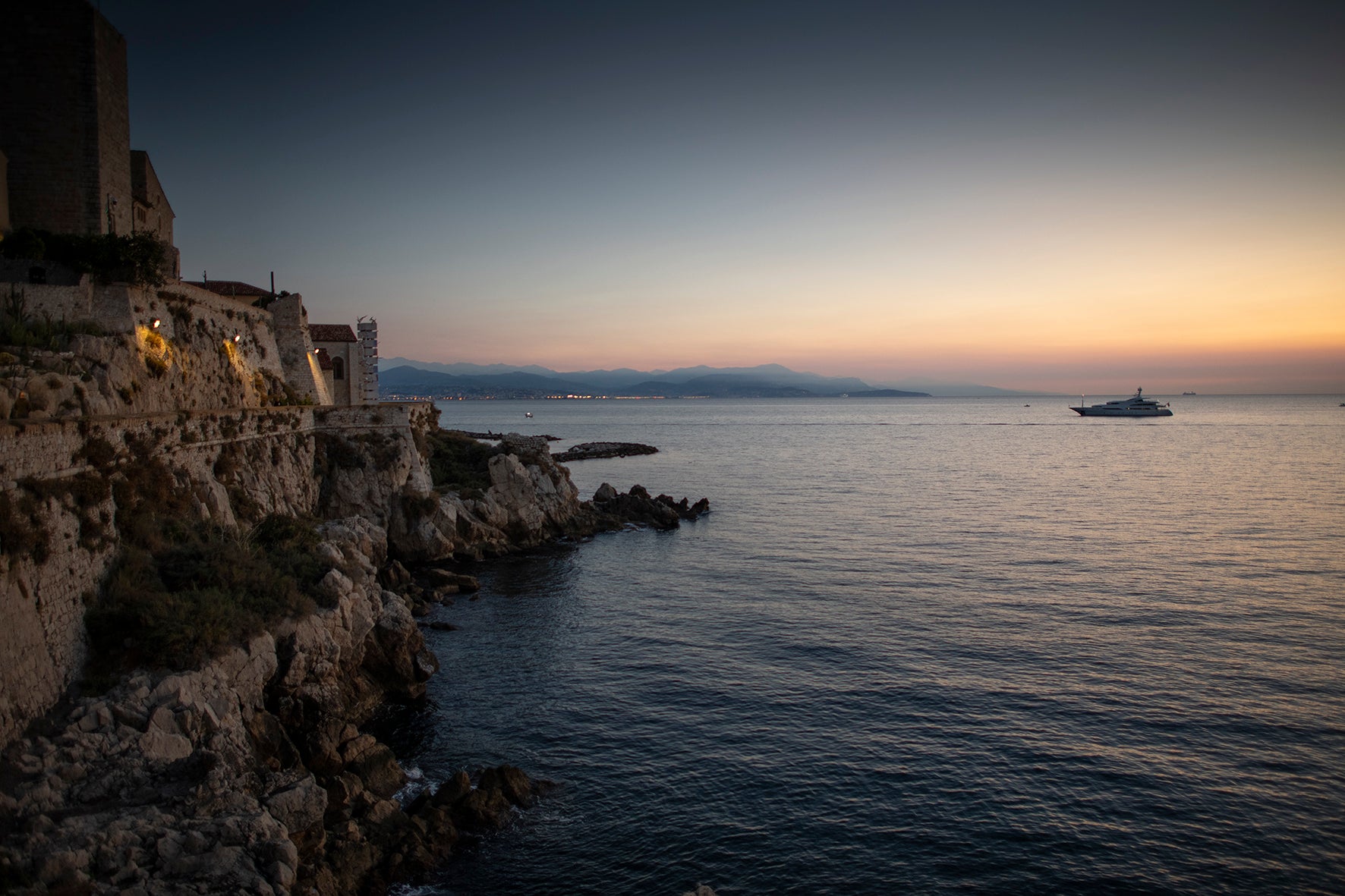 At first light, Antibes harbour awakens beneath a cool, gentle breeze as the distant lights of Nice flicker softly across the horizon. A serene moment suspended between night and day, this image captures the quiet grace of the Mediterranean before the world stirs — delicate, calm, and effortlessly timeless.